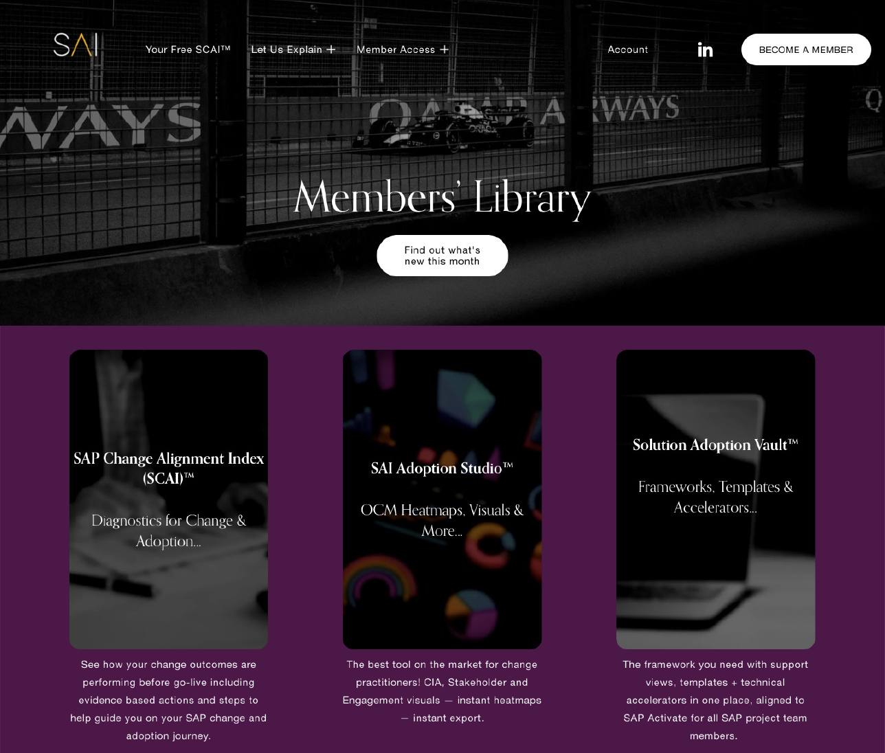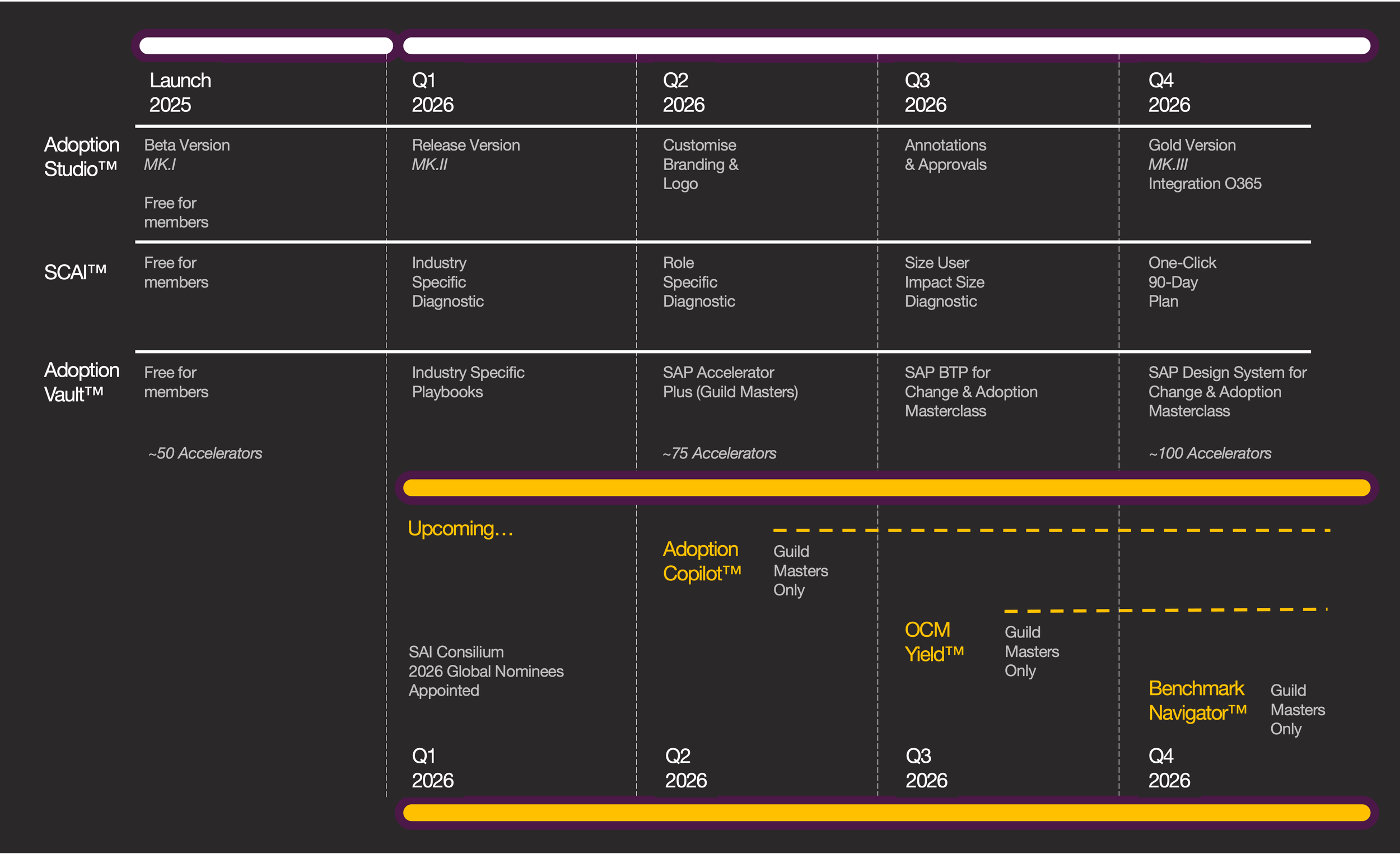 - Adoption Vault™ SAI Framework, Templates & Accelerators: Every artefact ever needed in one place (built for SAP), S/4HANA Impact Assessments, GUI-to-Fiori Tiles Mapping Lists, ECC6 Upgrade Comparison Checklists, Communication Playbooks, SAP accelerators enhanced by our chapter leads (IYKYK), Fiori User Profiles, SAP Journey Maps, Readiness Checklists, Leader Cascade Messaging, Adoption OKRs, SAP Change Experiences (Greenfield / Brownfield / Technical Upgrade). Do we keep going?